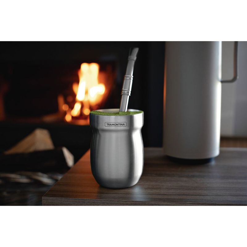 Los recipientes para mate en acero inoxidable Tramontina están hechos en doble pared de acero inoxidable con aislamiento al vacío para mantener las bebidas frías o calientes durante más tiempo.